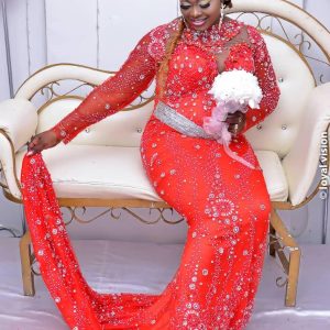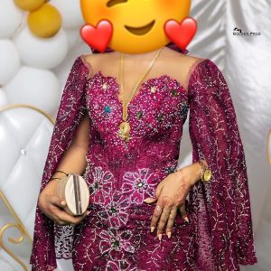 Tissu perlé vert menthe de 4 yards, cousue en robe de cérémonie très classe. Cette tenue est adaptée aux mariages, soirées de gala, graduation, et autres types de cérémonies.